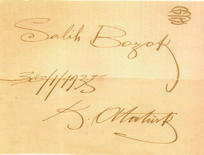 Etem ÇALIŞKAN’ın 1969’da hazırladığı bir çizimdeki kaligrafik imzanın Etem ÇALIŞKAN’ın ailesi Atatürk’e ait olmadığını söylemesi tüm tarihi belgeleri yok saymaları demektir. Çünkü Atatürk Salih BOZOK’a imzalayarak verdiği ıslak imzalı belgede 1935 yılında bahsi geçen imzayı kullanmıştır:
