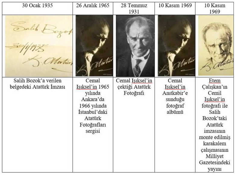 Atatürk’ün Fotoğrafçısı Cemal IŞIKSEL’de bu imzayı Etem ÇALIŞKAN’dan yıllar önce kullanmıştır: Demek oluyor ki Etem ÇALIŞKAN’ın ailesinin iddia ettiği kaligrafik çalışma özgün olarak Etem ÇALIŞKAN’a ait değildir imza bizzat ATATÜRK’e aittir. Etem ÇALIŞKAN ve Atatürk’ün fotoğrafçısı Cemal IŞIKSEL de tartışmaya mahal bırakmayacak şekilde bu imzayı ATATÜRK’ün 1935 tarihli Salih BOZOK’a imzaladığı “BOZOK soyadı hediye belgesi”nden almışlardır. Cemal IŞIKSEL “Atatürk Gazi Mustafa Kemal Fotoğraf Albümü”nün girişine 26.12.1965 tarihindeki Ankara Fotoğraf Sergisindeki şu cümleleriyle başlamaktadır: “ Atatürk hakkında, bugüne kadar çok şeyler yazıldı, çok şeyler anlatıldı. Ben de objektifimin gördüklerini sizlere getiriyorum. Bunların, tarihe ve gelecek kuşaklara, onu daha yakından tanıtmaya imkân vereceğine inancım var. Çünkü burada O, kendini anlatacak…” Foto Cemal Işıksel. Daha sonra sergilenen bu fotoğraflar 1969 yılında albüm şeklinde “Türk Tarih Kurumu” tarafından basılmıştır (Işıksel, 1969). 10 Kasım 1969 tarihinde de Cemal IŞIKSEL tarafından Anıtkabir Müzesi’ne teslim edilmiştir: