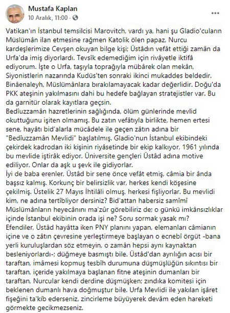 “Said-i Nursi döneminde mevlit diye bir uygulamanın olmadığına dikkat çeken Mustafa Kaplan, “Gladio’nun İstanbul ekibindeki çekirdek kadrodan iki kişinin riyâsetinde bir ekip kalkıyor, 1961 yılında bu mevlide iştirâk ediyor. Üniversite gençleri Üstâd adına motive ediliyor” diye yazarak, Nurcuların Batı merkezli istihbarat örgütleri ile temas halinde olduğunu iddia etti.