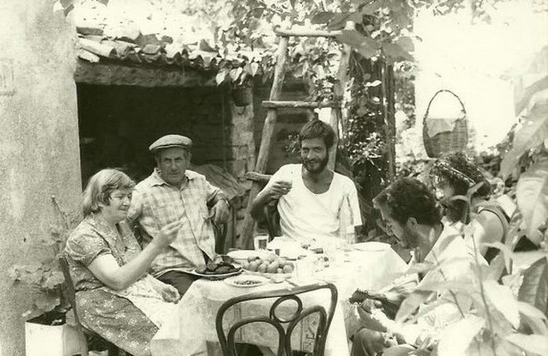 Zeytinliköy’de Fener Rum Patriği’nin babasının kahvehanesine uğruyoruz, içeride bir de berber koltuğu var, müşterisinin usturayla sakalını kesmesini bekliyoruz, sonra ocağa gidip taş havanda dövülerek ezilen dibek kahvelerimizi pişiriyor. Unutamadığım güzel insanlar da tanıyorum; Bademli’de bakkal Atanaş’ın taş evinin bahçesindeyiz. Karısı Anna lezzetli Rum mezeleriyle donatmış masayı. Onlar, Kaleköy’e yerleşen Melih’in yakınlık kurduğu komşu köylü arkadaşları. Adada geçirdiğimiz günlerden birinde, akasya ağacının altındaki dostlar sofrasına Füsun ve ben de dahil oluyoruz. Hoş geldiniz’le başlayan, Rum şiveli Türkçe ile koyulaşan muhabbet, öğle rakısıyla yudum yudum demleniyor. Aynı zamanda sözlerin arasına sazlar karışıyor, Melih ney üflüyor, Selman da uduyla eşlik ediyor alaturkaya; Tanburi Cemil Bey’den, Yorgo Bacanos’a, Acemaşiran’dan, Ferahfeza’ya… O sırada tiyatrocu arkadaşım Füsun çantasından fotoğraf makinasını çıkarıyor, keyifli beraberliğimizi ada hatıralarına eklemek için basıyor deklanşöre…