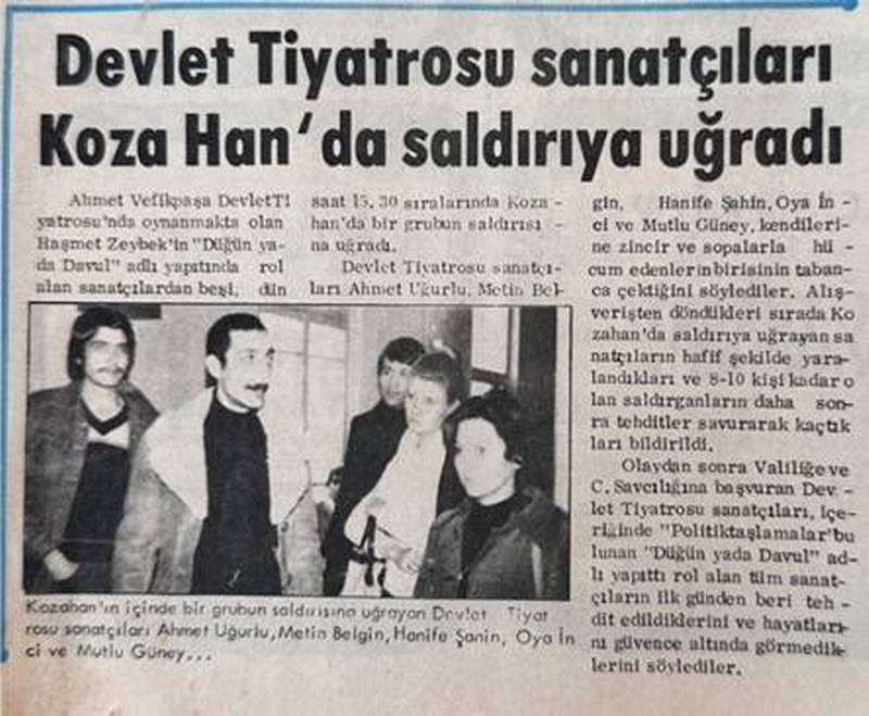 Korkunç bir olaya tanık olacaksınız şimdi, günlerden Pazartesi, DETÇA (Devlet Tiyatrosu Çalışanları) derneği yararına bilet satmak için Koza Han’da dolaşıyoruz; Ahmet Uğurlu, Hanife Uğurlu, Mutlu Güney, Oya İnci ve ben… Hanın alt katlarındaki tüccarlara uğradıktan sonra üst kata çıkıyoruz, Ulucami çıkış kapısına yaklaşırken, karşımızdan pis bakışlı, sarkık bıyıklı 4 kişi yaklaşıyor, neler oluyor demeye kalmadan, arkadan 3-4 kişi daha beliriyor, önümüzden arkamızdan kuşatılıyoruz. Aslında hayat normal akışında sanki, tavla oynayan esnaf da alışveriş eden ahali de görmezden geliyor hadiseyi, çemberi hızla daraltıyorlar, aniden arkamdan biri saçlarımdan tutup beni yere çöktürüyor, belinden silahı çekip kafama dayıyor, “Adın ne lan Ahmet mi?” diye bağırıyor, Ahmet’in o kargaşada kapıdan fırladığını görüyorum, “Sana ne!” diye haykırıyorum, tetiği çekmeye hazır tekrarlıyor: “Adını söyle lan!” O anda Oya bağırıyor arkamdan; “Metin, onun adı Metin, Ahmet değil!” Herif silahı kafama vurup tehdidini savuruyor: “O herife söyleyin, yaşatmayacağız onu!” Sonra hiçbir şey olmamış gibi çekip gidiyorlar, kimse de hiçbir şey görmemiş gibi… Valiliğin yolunu tutuyoruz hemen, suç duyurusunda bulunuyoruz, akşam tiyatroyu sivil polisler dolduruyor. Ayrıca, daha önce bahsettiğim ayakkabı boyacısı, artık aksesuarcı Ferit Baba hadiseyi öğrenince çeribaşı olarak mahallesine haber salıyor, 1 kamyon dolusu roman genç tiyatronun çevresinde olası saldırıya karşı nöbet tutuyor. Ama yine de ilk kez keyifsiz, tatsız, gergin çıkıyoruz sahneye…