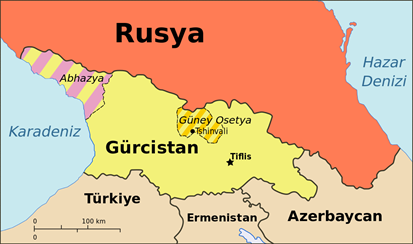 Saakaşvili, tam anlamıyla batıya entegre olmuş ve toprak bütünlüğünü sağlamış bir Gürcistan vaat etmişti. Bu vaadin ancak ve ancak hayal olabileceğini fark etmişsinizdir. Batıyla flörtünü sürdürürken Saakaşvili, toprak bütünlüğünü sağlamak adına Abhazya ile Güney Osetya’ya saldırı hazırlığı yaparken adı geçen ülkeler referandum yaparak bağımsızlıklarını ilan etmişlerdir. Bu bağımsızlık süreci Putin tarafından tasarlanmış olup ülkelerin bağımsızlıkları sadece Rusya tarafından tanınmıştır. Putin, Rusya’nın menfaatleri doğrultusunda çekinmeden Kafkasya ülkelerinin içişlerine karışmıştır. Gürcistan, Batının verdiği gazla geçmişteki Fırtına Harekatı’nı taklit ederek Abhazya ve G. Osetya’ya savaş açtı Ardından Rusya da Gürcistan’a savaş açmıştır. Rusya’nın Gürcistan’a savaş açmasının asıl sebebi Gürcistan’ın Batı ile flört edip Rusya’nın güdümünden çıkmak istemesiydi. Abhazya ve G. Osetya ikincil sebeplerdir. Savaş, 8 Ağustos 2008 de başlamış ve 16 Ağustos 2008’de bitmişti. Savaş başlar başlamaz Rusya, Gürcistan’ın elektriğini kesmiştir. Bunun üzerine Gürcistan’a elektrik Türkiye tarafından sağlanmıştır. Bir düşünsenize. Rusya ile savaşı göze alıyorsunuz ancak Rusya elektrinizi kesiyor. Siz çoktan yenilmişsiniz aslında. Savaş, Rusya’nın galibiyetiyle sonuçlanırken Rus tanklarının Gürcistan Meclisi’ne 23 km kala durduğu hep konuşula gelmiştir. Aşağıdaki haritada Gürcistan, Abhazya, G. Osetya ve Rusya’yı görmektesiniz.