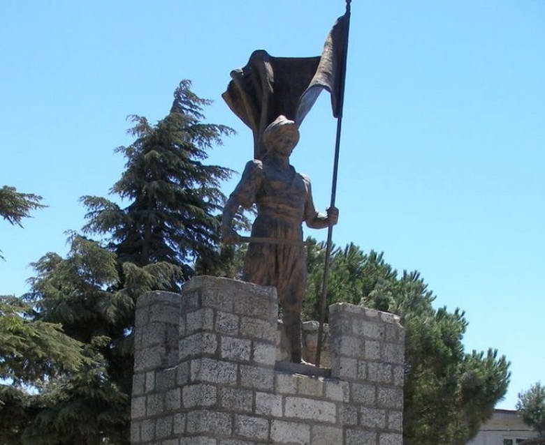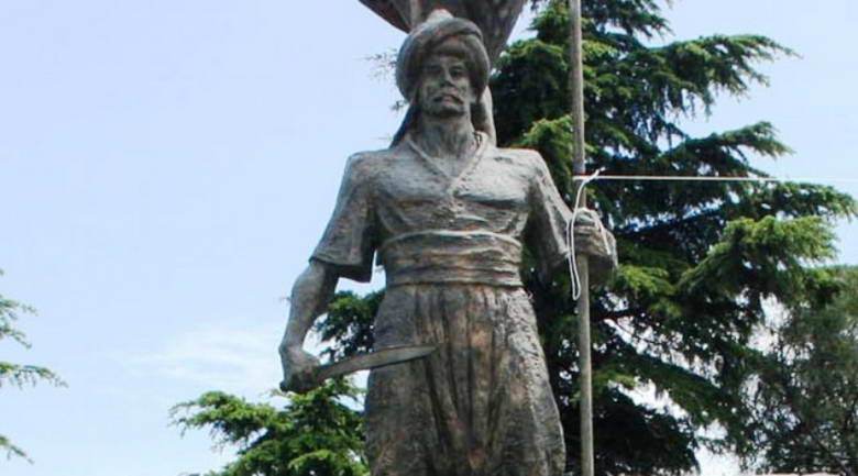 Fâtih Sultan Mehmed’in Topkapı (Romanos) burcuna çıkarak ilk sancağı diken şehid Sancaktârı Ulubatlı Hasan Ağa’nın Ulubat’ta yer alan eski heykeli. Karacabey/Bursa