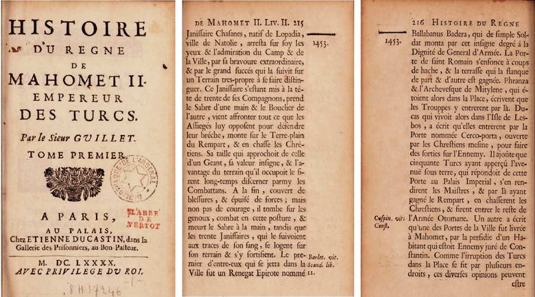 Ünlü Fransız yazar Georges Guillet de Saint-George’un Histoire du regne de Mahomet II. Empereur des Turcs adlı monografisinin ilk cildinin iç kapağı ve onun, Ulubatlı Hasan’ın “yüksek statüye sahip bir kumandan”, Balaban’ın ise “onun askerlerinden biri” olduğunu açıkladığı satırlar (Paris 1681, p. 214-216).