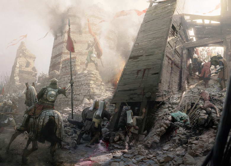 Ulubatlı Hasan Ağa ve sekbanlarının Topkapı (Hagios Romanos) bölgesinde açılan gedikten sancak dikmek ve şehre girmek üzere burca çıkışları. Jose Daniel Cabrera Peña, Constantinople 1453.