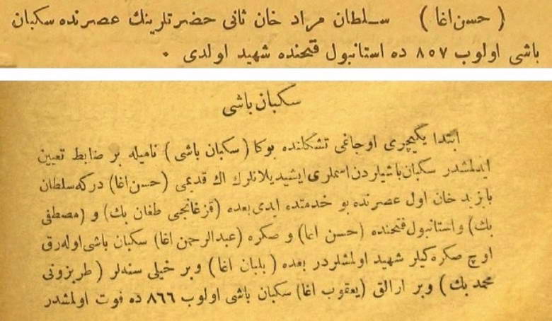 Baba Hasan Ağa’nın II. Murad zamânından beri Sekbanbaşı olup, İstanbul’un fethinde şehid olduğunu ve ondan daha önce Mustafâ Beg, şehâdetinden sonra ise Abdurrahman Ağa ile Balaban Ağa’nın da sekbanbaşı seçildiklerini anlatan Mehmed Süreyyâ’nın Sicill-i ʿOs̱mānī’deki kayıtları. Sicill-i ʿOs̱mānī, II, 118; IV, 770.