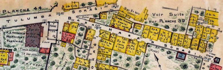 Jacques Pervititch’in 1934’te çizdiği haritada Baba Hasan Sokağı’nı, Baba Hasan Camisi’ni ve ‘Alemdâr Baba Hasan Ağa’nın kabrini yüksek duvarlı bir türbe olarak kaydettiği kesit.